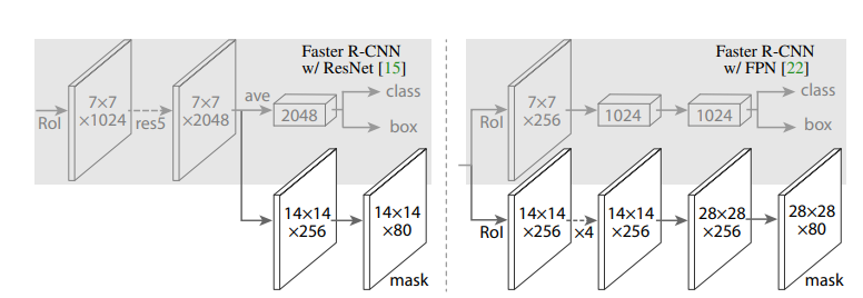 위에서 설명한 그대로이다. Classification + Bounded Box 을 예측하는 기존의 Faster R-CNN에 Mask를 예측하기 위한 branck가 하나 더 병렬적으로 추가되어 있다.