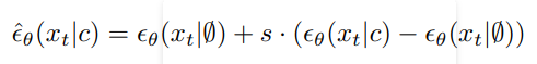 GLIDE는 Classifier-guidance을 좀 더 발전시킨 방법 두가지를 각각 활용한다. 첫번째는 Classifier-free guidance이고, 두번째는 CLIP-guidance이다. 먼저 Classifier-free guidance는 Classifier-guidance가 별도의 classifier를 요구한다는 단점을 해결한 원리로써, null label(label이 없음)을 사용했다. 구체적인 수식은 아래와 같다.
