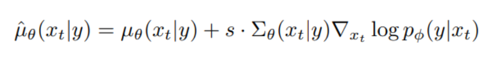 위 수식이 Classifier-guidance을 나타낸 것인데, 여기서 y가 label을 뜻한다. 수식의 두번째 term을 보면, log-probability의 gradient가 주어져있는데, 이는 classifier에 의해 예측된 target class의 log-probability를 뜻한다. 여기서 알아야 할 점은 Classifier-guidance는 별도의 classifier를 필요로 한다는 점이다.