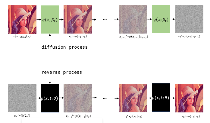 위 그림은 Diffusion 모델을 한눈에 파악할 수 있는 그림이다. Diffusion 모델의 원리는 크게 두가지 단계로 설명될 수 있는데, 첫번째 과정이 diffusion process이다. 이 과정은 하나의 이미지(x0)에 noise(보통은 가우시안 노이즈)를 조금씩 입히는 과정으로 생각할 수 있다. diffusion process를 거치면 위 그림에서 알 수 있듯이 최종적으로 하나의 이미지가 noise 형태(xt)로 변하게 된다. 다음 과정은 reverse process로, 한마디로 diffusion 과정의 역과정이다. 즉, diffusion 과정의 최종 output인 noise(xt)로부터 input 이미지(x0)를 만들 수 있는 파라미터들을 학습하는 과정이라 생각하면 된다.
