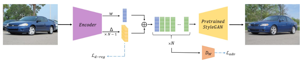 모델의 구조는 위 그림과 같다. encoder를 통해 뽑아내는 것은 single latent vector(w)와 이에 더해줄 N-1개의 델타값들(N=style vector의 개수)을 구하는 것이다. 여기서 single latent vector가 하는 역할이 pretrain된 StyleGAN의 latent space를 대표하는 벡터라고 생각하면 된다. 개인적으로 single latent vector 조차도 infer하지 않고, psp처럼 평균을 사용해도 가능하다고 생각했다.