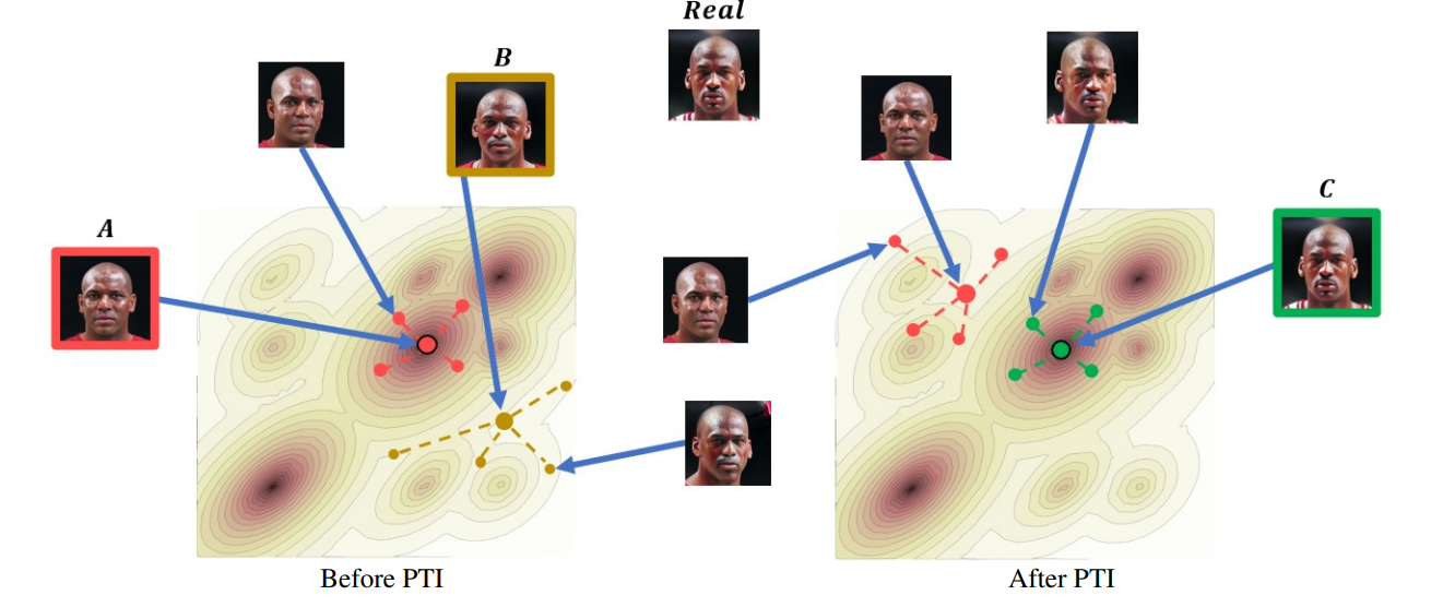 오른쪽이 pivotal tuning을 진행하기 전, latent space에 놓여 있는 latent vector들이 만들어 내는 이미지(A, B)이다. A가 위치한 붉은색 지역은 Pretrained StyleGAN의 original latent space에 거의 근접한 곳으로, editability는 높지만, distortion이 심한 곳이다. 반면 붉은색이 아닌 외곽의 B가 위치한 곳은 distortion은 적지만, editability가 좋지않는 곳이다. Pivotal tuning은 B를 editability가 높은 붉은 지역으로 옮겨주는 효과를 낸다. 위 그림의 오른쪽의 C를 보면, real image와 거의 흡사하면서(distortion 적음), editing 역시 잘 이뤄진다는 것을 확인할 수 있다.