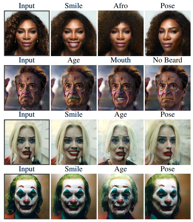 Pivotal Tunining을 적용하여 StyleGAN Generator를 finetuning한 이후에는 다양한 manipulation기법(StyleCLIP, linear direction..etc)을 그대로 적용하여 editing을 진행하면 된다. 아래는 논문에 제시한 몇가지 결과 이미지이다.
