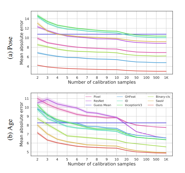 real value가 camera Pose, Age에 대해서 regression의 결과를 나타낸 것이다. 다른 모델들은 latent space에서의 distance가 아닌 image pixel space, 모델에 의해 학습된 feature space에서의 distance를 활용하여 regression을 진행했다. 그 결과 논문에서 제시하는 방법이 가장 좋은 성능을 낸다는 것을 보여주고 있다. 이는 또한 latent space에서의 distance가 regression에서 discriminative한 feature임을 해석할 수 있다.