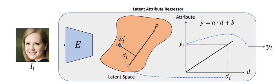 이제 회귀방정식의 독립변수인 distance를 계산하는 방법을 알았으므로, 회귀방정식을 구해보자. 방정식은 독립변수가 distance 하나이므로, 최소 두장의 이미지에 대응하는 distance(x)와 에측하고자하는 real value값(y)이 데이터로 필요하다. 가지고 있는 이미지를 Encoder를 사용하여 Inversion을 진행하고 distance를 계산한뒤, 회귀분석을 통해, 하나의 방정식이 도출되면 이후 새로운 이미지에 대한 real value값을 찾을 수 있다. 이러한 일련의 과정은 결국 latent space에서 distance라는 feature만 계산하면 few shot regression이 가능함을 보여주는 것이다.