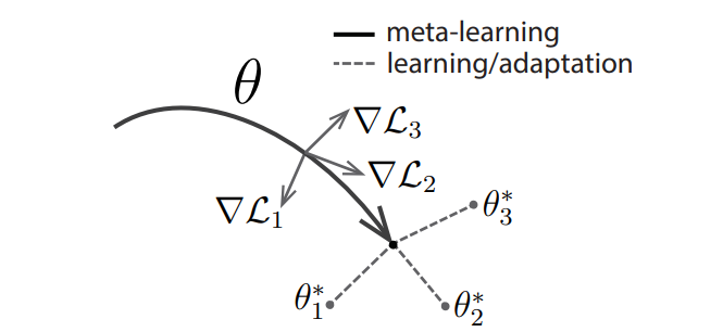 위 그림은 MAML을 설명하는 그림이라고 할 수 있다. 앞서 설명했듯이 MAML은 여러 task에 general 한 initial parameter를 구하는 알고리즘이라고 할 수 있다. 위 그림과 같이 task1, task2, task3가 있다고 한다면, 각 task는 각자의 optimal parameter가 존재할 것이다. (위 그림에서 세타1, 세타2, 세타3) 이는 각각의 loss를 계산하여 back prop을 통해 접근할 수 있을 것이다. 다시 MAML로 돌아와서 그렇다면 여기서 general 한 initial parameter를 찾는다는 것은 어떤 의미일까? 이는 이렇게 각각 존재하는 이 세개의 optimal parameter에 세 task 모두 단 몇 번의 gradient step을 통해서 접근하도록하는 initial parameter을 찾는 것이라고 할 수 있다.